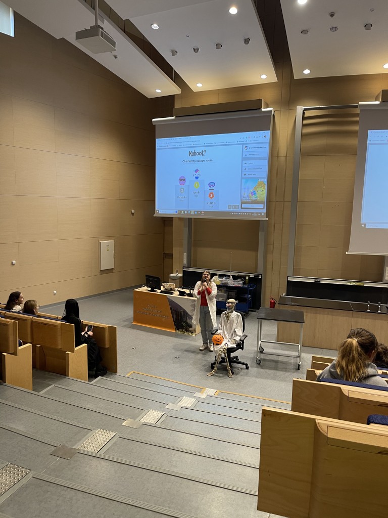 Naszym ostatnim punktem programu był Wydział Chemii Uniwersytetu Jagiellońskiego, gdzie uczestniczyliśmy w pokazie „Chemiczny escape room”. Wspólnie rozwiązywaliśmy chemiczne zagadki na podstawie eksperymentów wykonywanych przez dwóch chemików sądowych z długoletnim doświadczeniem. Pokaz zakończony był quizem sprawdzającym wiedzę uczestników.