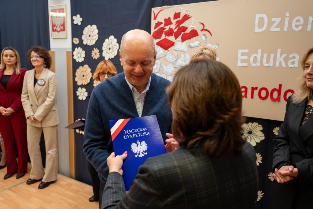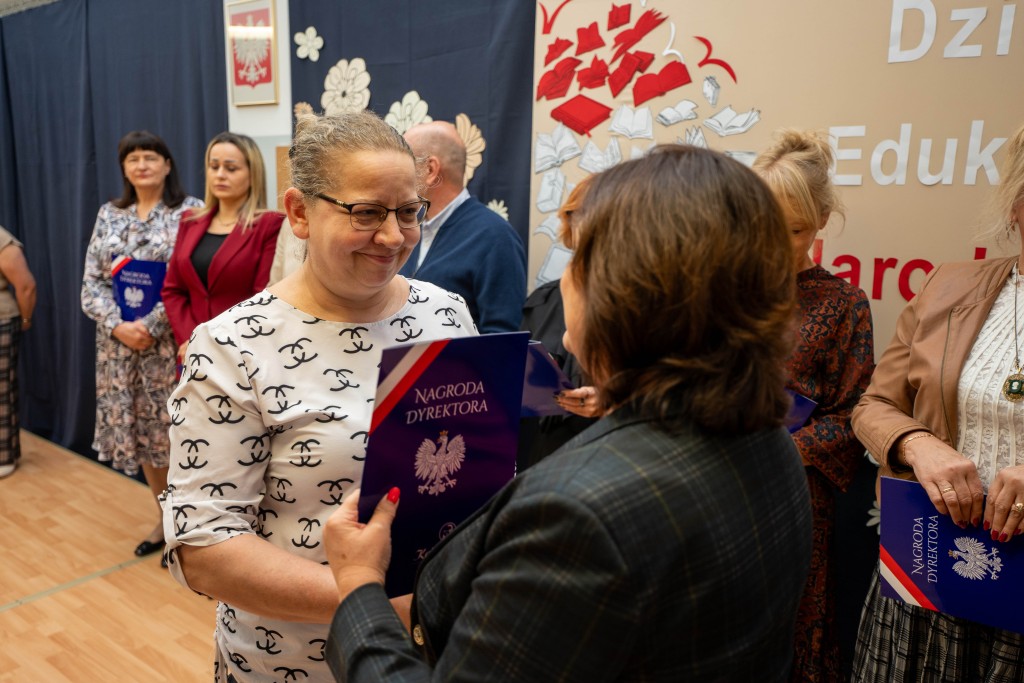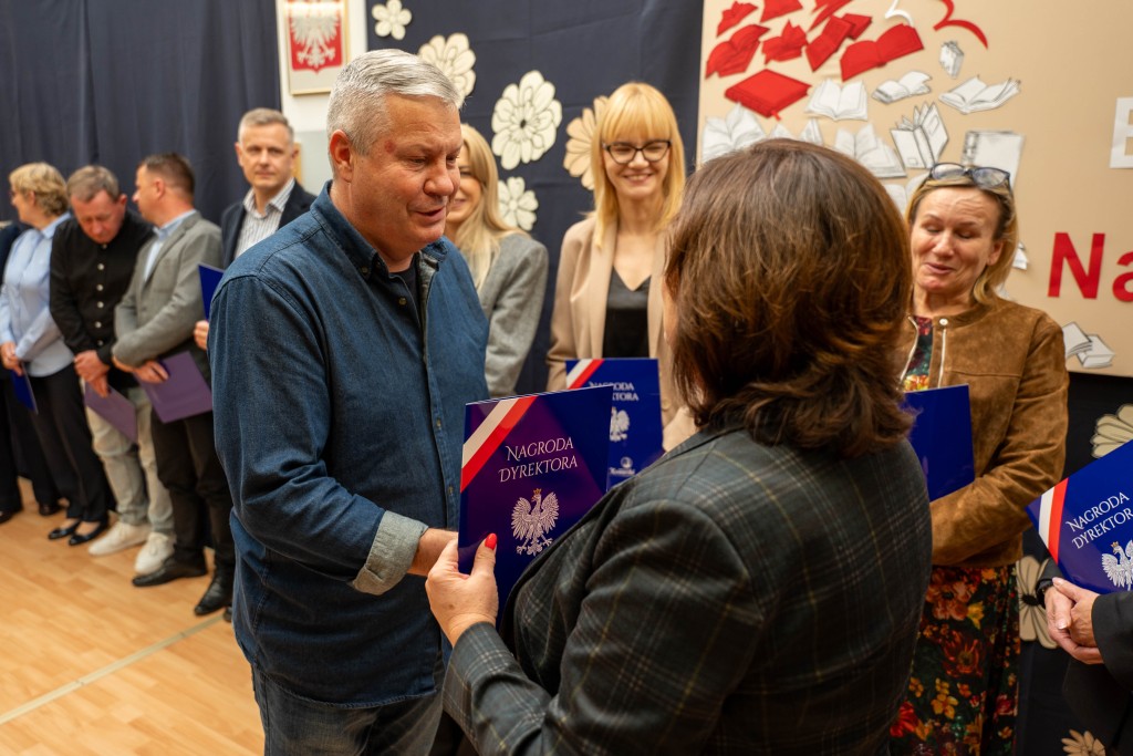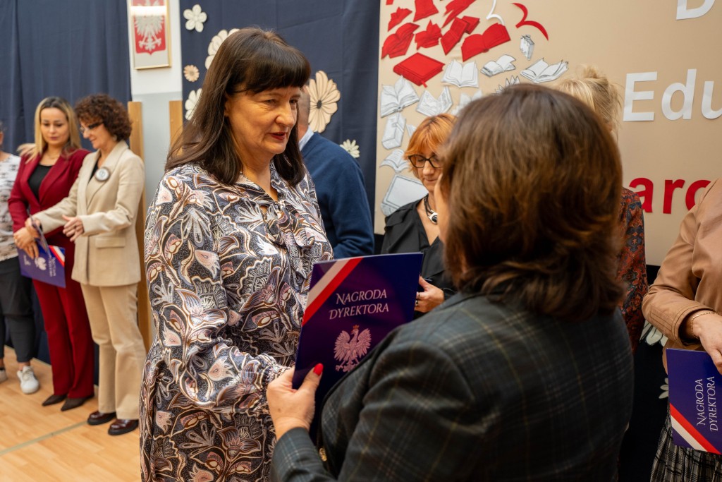 Podczas uroczystości Pani Dyrektor Małgorzata Wojtasik wręczyła nagrody nauczycielom oraz pracownikom administracji i obsługi, dziękując im za zaangażowanie, trud, pasję, cierpliwość oraz codzienną pracę na rzecz uczniów i całej społeczności szkolnej. Życzenia dla nauczycieli złożyli również przedstawiciele Rady Rodziców.