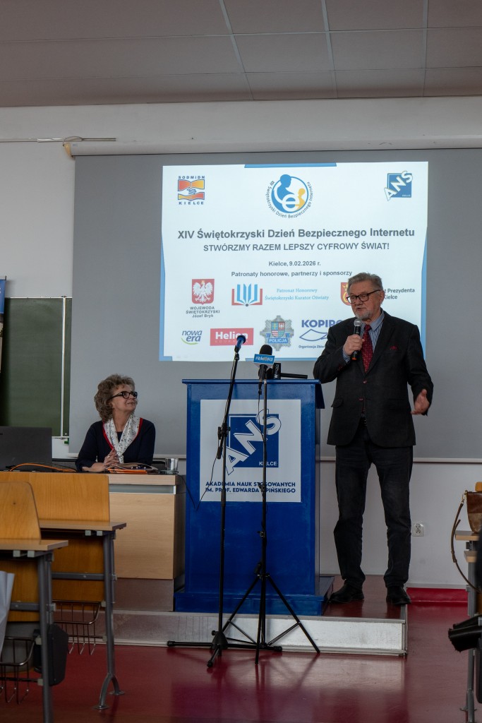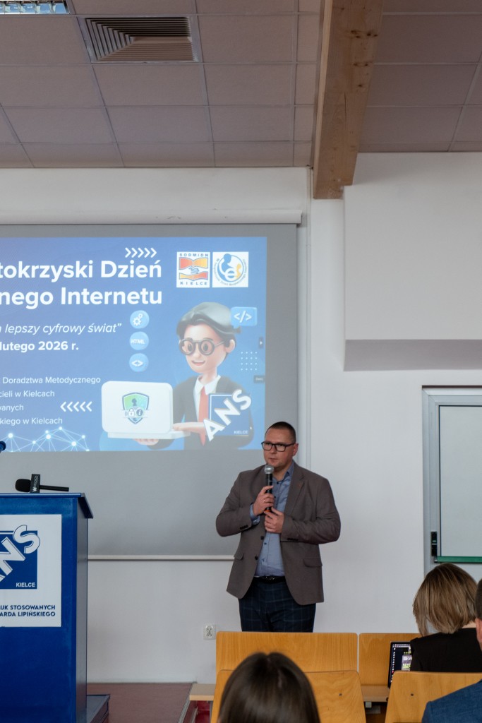W dniu 9 lutego 2026 roku uczniowie technikum informatycznego, działający w szkolnym kole informatycznym „Film & Fotografia”, wzięli udział w XIV edycji Świętokrzyskiego Dnia Bezpiecznego Internetu. Wydarzenie zostało zorganizowane przez Samorządowy Ośrodek Doradztwa Metodycznego i Doskonalenia Nauczycieli w Kielcach oraz Akademię Nauk Stosowanych im. prof. Edwarda Lipińskiego w Kielcach. Uczniowie, wraz z opiekunem, odwiedzili kielecką uczelnię, gdzie uczestniczyli w specjalnie przygotowanych zajęciach edukacyjnych.