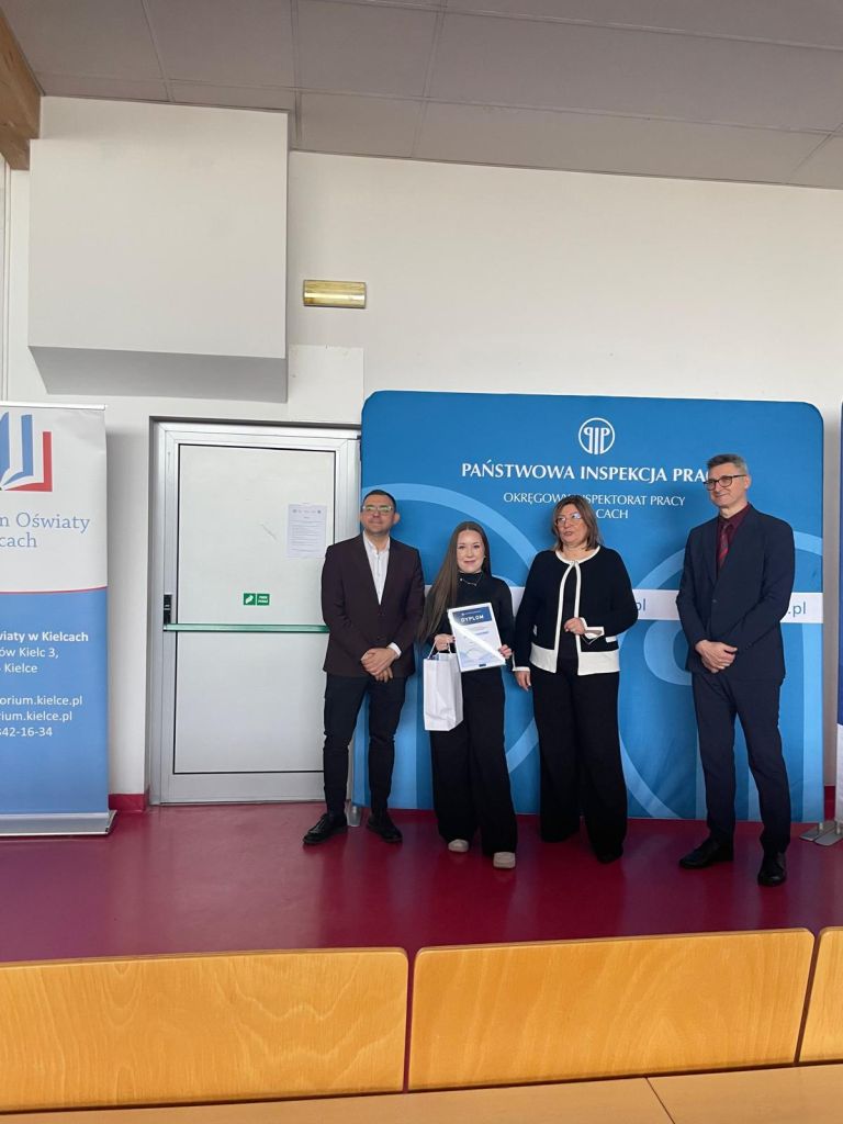 W dniu 10 marca 2026 r. Okręgowy Inspektorat Pracy w Kielcach we współpracy z Akademią Nauk Stosowanych im. prof. Edwarda Lipińskiego w Kielcach przeprowadził kolejną XIII już edycję regionalnego etapu ogólnopolskiego konkursu pod nazwą „Poznaj swoje prawa w pracy”, w którym wzięli udział laureaci etapów szkolnych z terenu województwa świętokrzyskiego. Naszą szkołę reprezentowały Nikola Marzec z klasy 4E i Dagmara Wojsław z klasy 3TE.