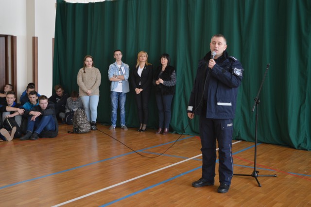 Opowiadał min. o kierowaniu pojazdami pod wpływem alkoholu, narkotyków lub dopalaczy, konsekwencjach prawnych zgodnie z KK, konsekwencjach społecznych zarówno dla osób będących pod wpływem środków uzależniających jak również dla ich towarzyszy, poruszaniu się pojazdami zgodnie z przepisami oraz dostosowaniu prędkości do warunków zimowych. Młodzież z zainteresowaniem słuchała konkretnych przykładów, które wydarzyły się na terenie naszego powiatu w przeciągu ostatnich miesięcy, które niewątpliwie powinny wpłynąć na wyobraźnię naszych uczniów.